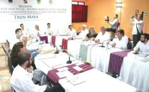 Según dijo el presidente electo, el Tren Maya pretende consolidarse en su sexenio, y por tanto, ya se trabaja en esta reunión con los mandatarios de: Tabasco, Arturo Núñez (PRD) y Adán Augusto López (Morena); Chiapas, Manuel Velasco (PVEM) y Rutilio Escandón (Morena); Campeche, Alejandro Moreno (PRI); Yucatán, Rolando Zapata (PRI) y Mauricio Vila (PVEM); y de Quintana Roo, Carlos Joaquín González.