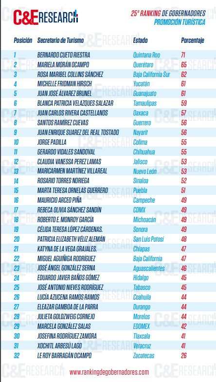 De acuerdo a una encuesta publicada por C&E Research sobre si ¿Usted que tan bien considera que el gobernador y su respectivo secretario están promoviendo la imagen turística del estado? la Secretaría de Turismo de Quintana Roo fue la mejor posicionada del país.