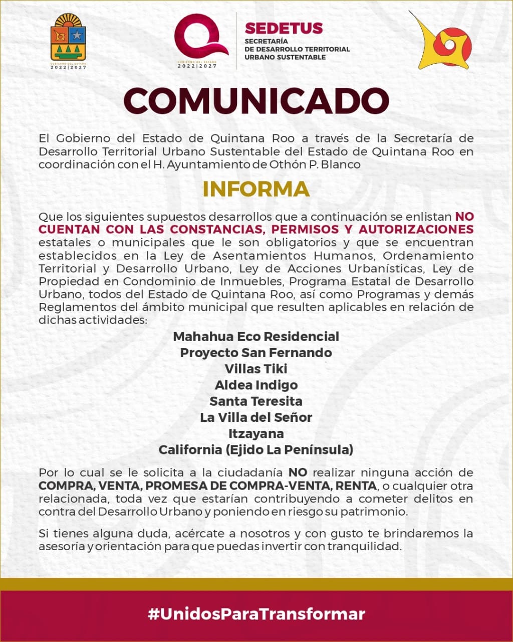 El Gobierno del Estado de Quintana Roo, a través de la Secretaría de Desarrollo Territorial Urbano Sustentable (SEDETUS), en coordinación con el H. Ayuntamiento de Othón P. Blanco, informa a la ciudadanía sobre la existencia de diversos supuestos desarrollos inmobiliarios que no cuentan con las constancias, permisos ni autorizaciones estatales o municipales requeridas por la normatividad vigente.