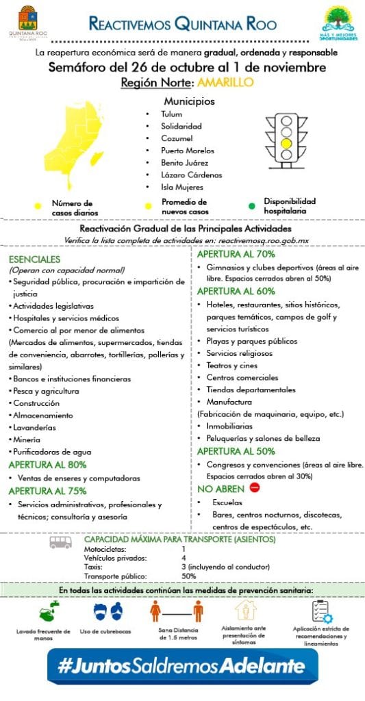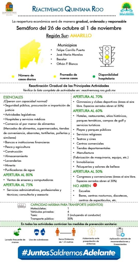 Esta medida es aplicable para la semana del 22al 29 de octubre, lo que significa que los 11 municipios de Quintana Roo permanecerán en color amarillo, lo que significa un aforo de 60% en la mayoría de los rubros comerciales, como hoteles.