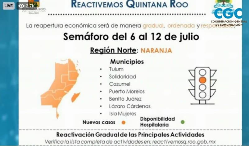Chetumal.- Por otra semana más, del próximo lunes, 6 al 12 de julio, tanto la zona norte como la zona sur de Quintana Roo permanecerán en nivel “naranja” , aunque éste último se mantiene en este estado “con las uñas”, ya que Othón P. Blanco ha sufrido un fuerte incremento en los casos.