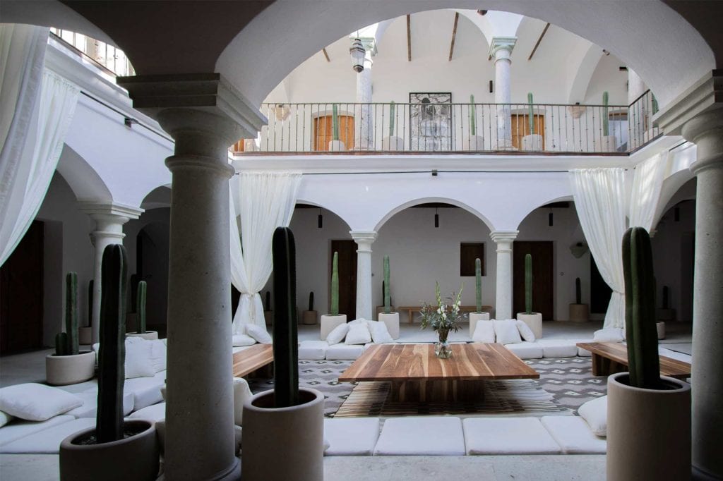En una construcción del siglo XVII se aloja un hotel vanguardista que mezcla la arquitectura colonial de Oaxaca con elementos de diseño que recuerdan a la cultura árabe del norte de África. Mientras que el patio está cubierto de textiles artesanales y decorado con cactáceas.