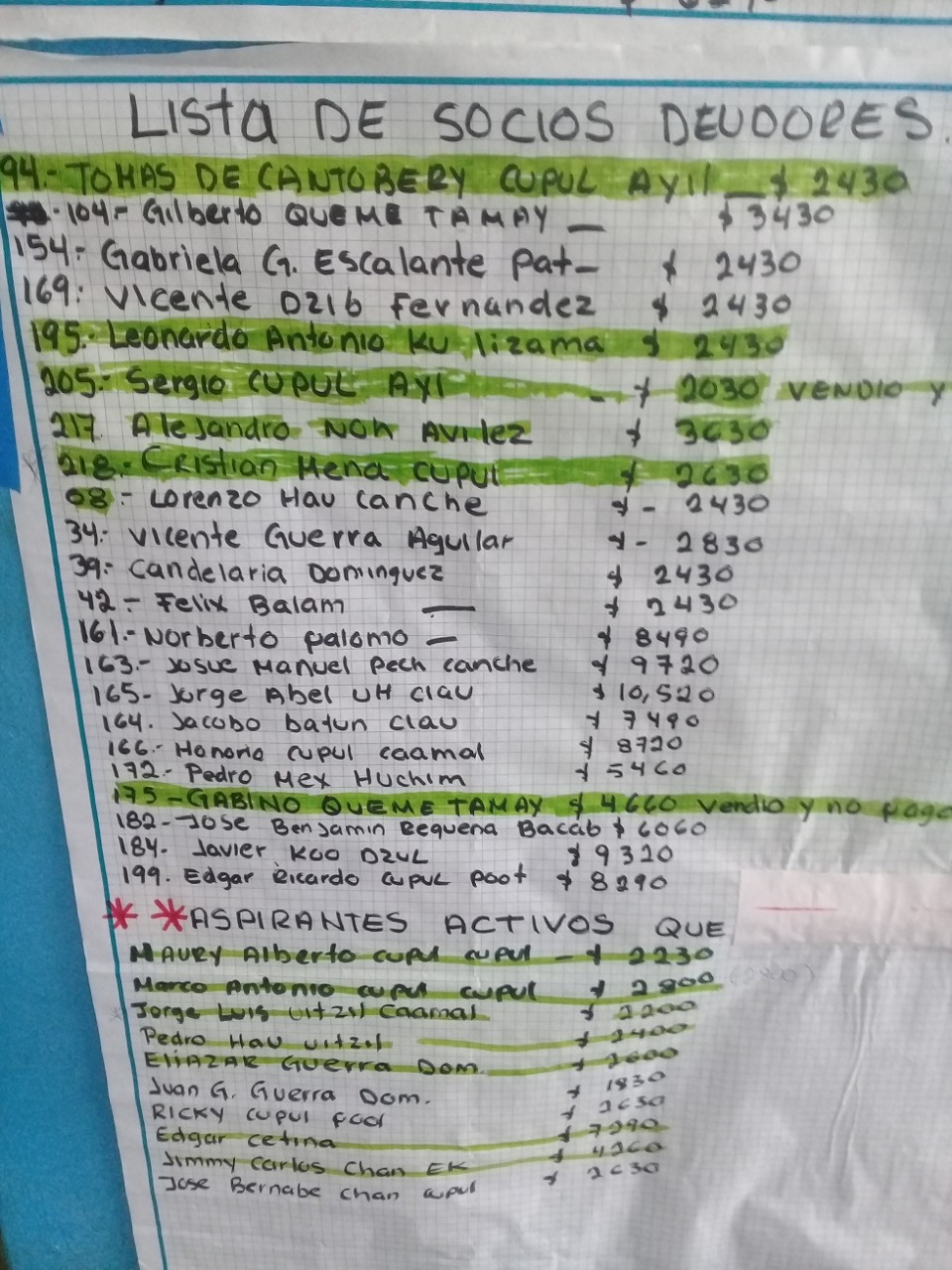 Vicente Dzib Fernández, socio taxista, afirmó que la lista la dio a conocer la aún tesorera, Rosa María Ay Ay, quien detalló que la mayoría de los socios debe hasta un año de cuotas; el monto de los adeudos, dice, va desde los dos mil pesos y hasta más de 20 mil pesos.