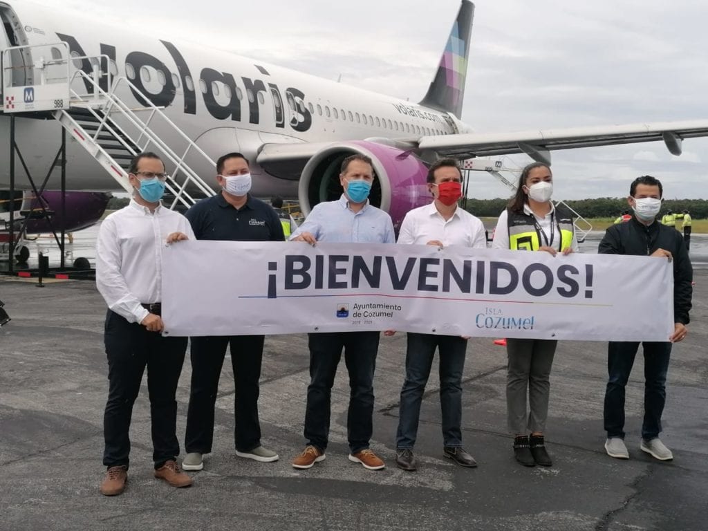 Cozumel.- Hoy arribó a la isla el primer vuelo de la ruta Ciudad de México-Cozumel de Volaris, suspendido desde hace cerca de medio año debido a la actual pandemia. En los próximos días y meses se espera el arribo de más vuelos procedentes de Estados Unidos y Canadá.