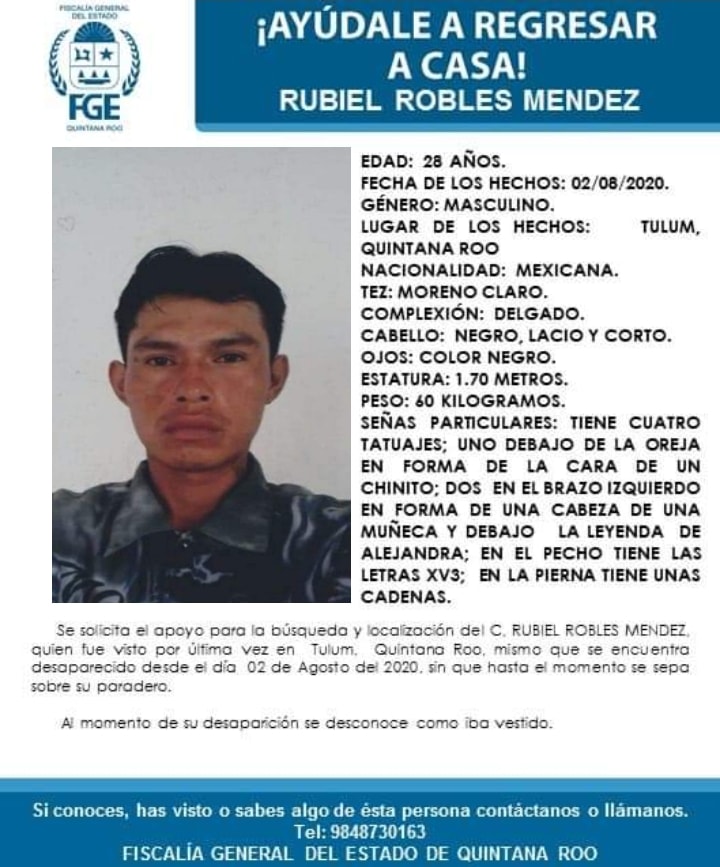 Según relata su padre, Rubiel Robles salió de Tulum con rumbo a Chiapas, sin embargo ya no llegó a du destino. Desde entonces han intentado dar con su paradero, solicitando ayuda en redes sociales y a las autoridades tanto de Chiapas como de Quintana Roo.