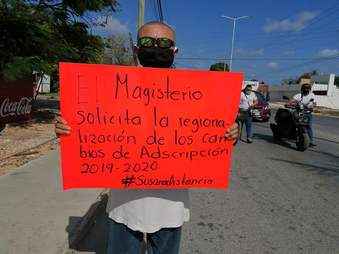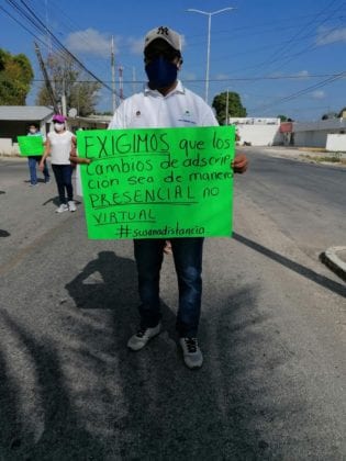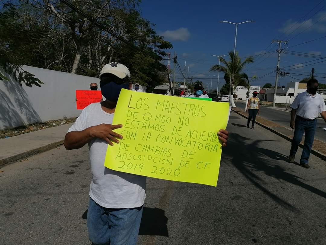 Espaciados en tres columnas y manteniendo al menos un metro de distancia con quienes los antecedían, los educadores marcharon hacia las oficinas centrales de la Secretaría de Educación de Quintana Roo (SEQ) para exigir que se suspenda este proceso debido a la actual emergencia sanitaria, pues alegan que estas solicitudes de cambios deben hacerse de forma presencial con representantes sindicales, para evitar un mal manejo de las plazas.
