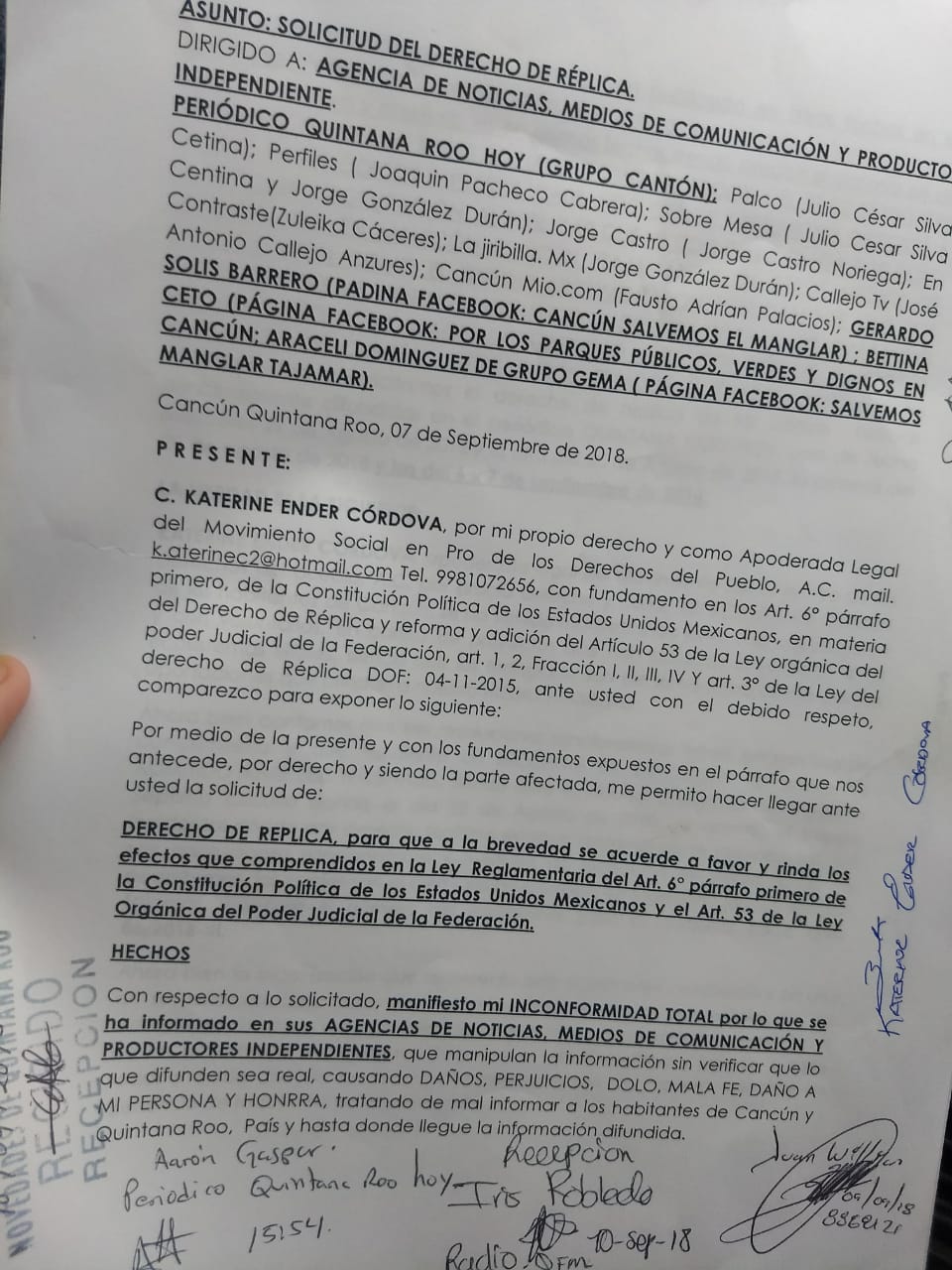 Katerine Ender acudió hoy a los periódicos Quequi, Quintana Roo Hoy y Por Esto, a solicitar por escrito el derecho a réplica.