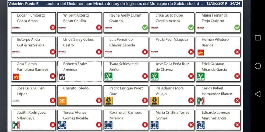 Los diputados de todos los partidos, incluido Morena, mismo que el gobierno municipal de Solidaridad, votaron primero por adelantar en el orden del día el caso de Solidaridad, para luego decidir por rechazar su paquete fiscal, de forma que se regresa a la Comisión de Hacienda.