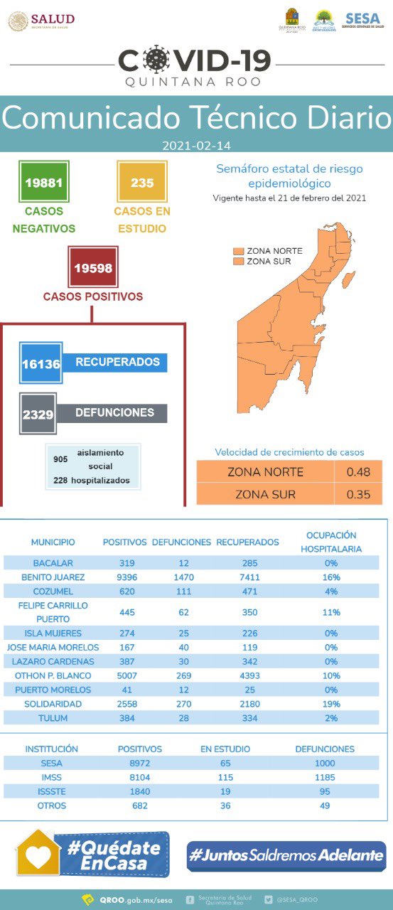 La autoridad sanitaria informó que hasta ahora hay 905 personas en aislamiento y 228 hospitalizadas en Quintana Roo a causa del Covid-19.