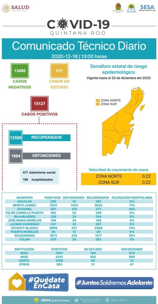 Los decesos de hoy ocurrieron en Cozumel, en Othón P. Blanco y en Chetumal. En cuanto a los casos confirmados, 24 son de Othón P. Blanco, 11 de Benito Juárez, siete de Solidaridad, dos de Cozumel y uno de Lázaro Cárdenas.