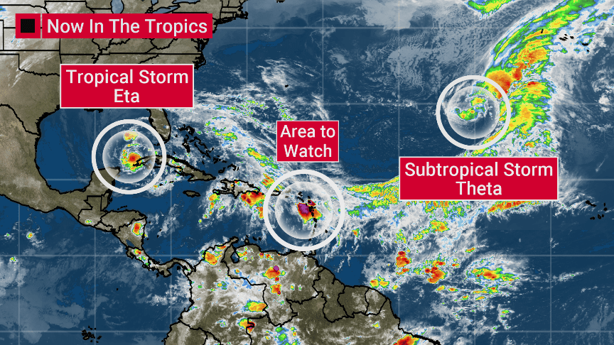Continua el escurrimiento de la masa de aire continental polar muy modificada sobre la península de Yucatán, se asocia con la amplia circulación periférica de la tormenta tropical ETA localizada en superficie y ubicada en la porción este del canal de Yucatán, que influencia la entrada de humedad a la porción norte de la citada península de Yucatán; lo que generan, nubosidad variable con posibilidad de algunas nubes de tormenta, lluvias, así como, posibles chubascos ocasionales aislados, se mantendrán las temperaturas de frescas a calurosas durante el día, viento fresco y arrachado del noroeste y norte; en la Península de Yucatán y principalmente en la zona norte del estado de Quintana Roo, durante el día.