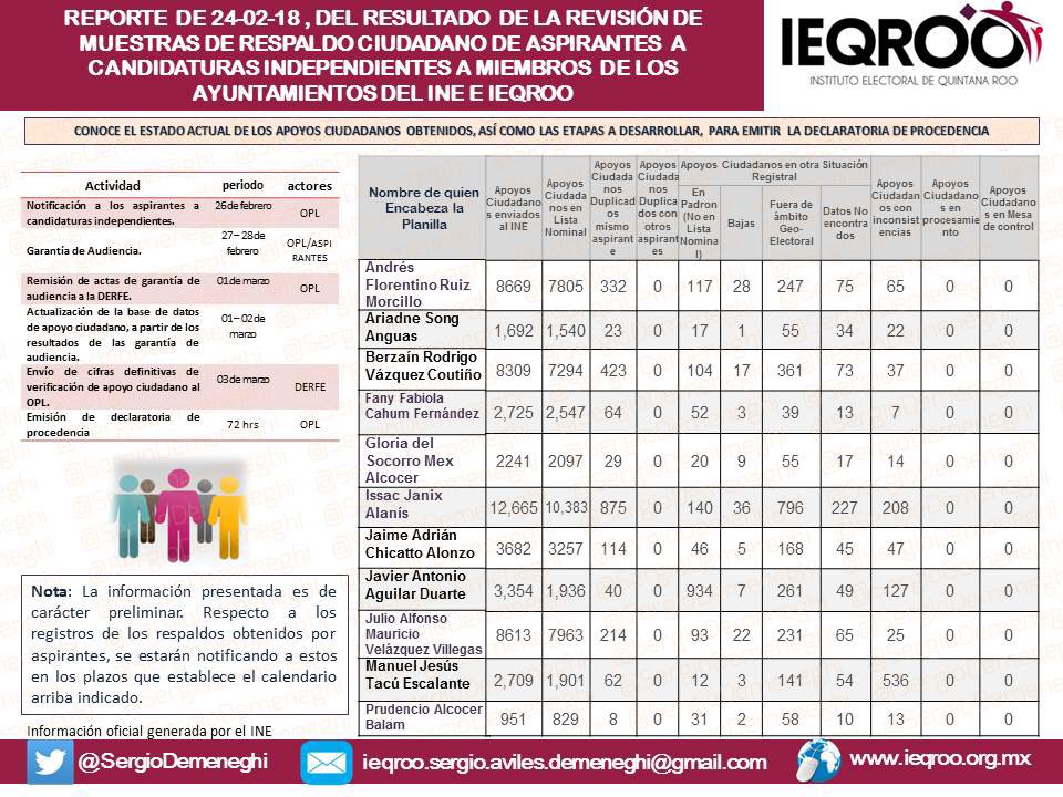 De acuerdo con el resultado de la revisión de muestras de apoyo ciudadano, elaborado por el Instituto Electoral de Quintana Roo (Ieqroo), Velázquez Villegas tendría 7 mil 963 firmas por 7 mil 805 de Ruiz Morcillo.