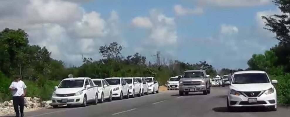 Cancún.- Integrantes del Sindicato de Taxistas “Andrés Quintana Roo” encabezan una manifestación en la avenida Huayacán, estacionando sus unidades a los costados de la cinta asfáltica, pero sin llegar a obstruir la circulación.
