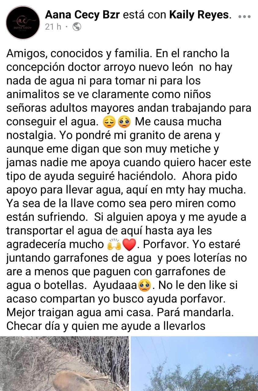 Este es un caso en Nuevo León, en el Rancho La Concepción Doctor Arroyo, que alguien comparte en redes sociales con la intención de que se le pueda apoyar a esta gente. Pide a la gente que no le dé like, sino que busque los medios para ayudar, llevando agua, donándola.