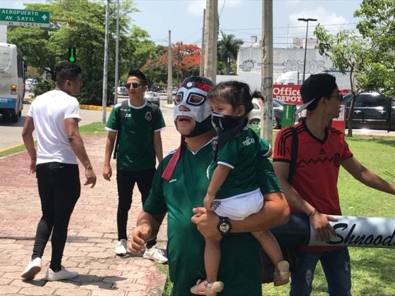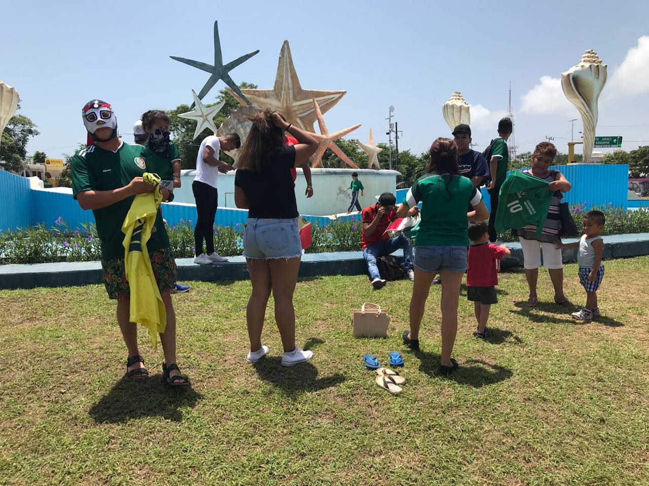 El reducido grupo de aficionados, sin perder la picardía mexicana, portaron los informes verdes, banderas tricolores, la tradicional máscara mexicana, hasta uno que otro con la pancarta de agradecimiento a Corea del Sur que, al vencer al campeón Alemania, ayudó a la selección azteca a clasificarse a la segunda ronda.