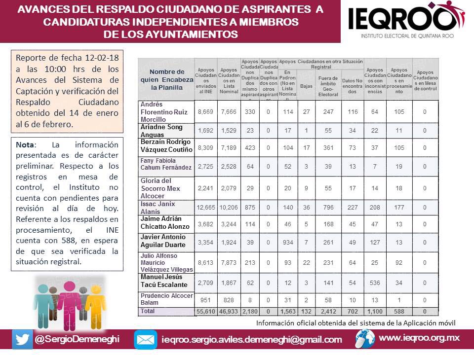 Chetumal.- El Instituto Electoral de Quintana Roo, a través de uno de sus consejeros, hizo públicas hoy la información pormenorizada sobre los apoyos dados a cada uno de los candidatos independientes, en los que se mantiene una ligera ventaja, de 207 votos, por parte de Julio “Taquito” Velázquez Villegas sobre Andrés Ruiz Morcillo, en Othón P. Blanco.