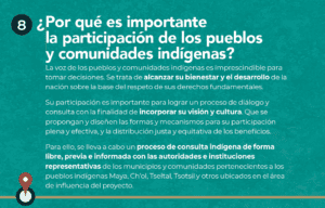 “El Instituto Nacional de Pueblos Indígenas (INPI) será órgano interno, la Secretaría de Gobernación es el órgano técnico y la responsabilidad total es de Fonatur, este fin de semana serán 15 asambleas Regionales en Tabasco, Chiapas, Campeche, Yucatán y Quintana Roo, serán 15 sedes con dos momentos; la fase informativa, se le dará a la autoridades convocadas la información con respecto, después vendrá el proceso de información a cada una de las comunidades y la asamblea consultiva será el 15 de diciembre”, argumentó Anabel López, representante del INPI y encargada de la Consulta en Pueblos originarios.