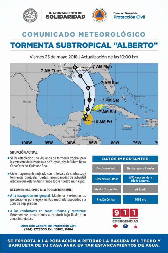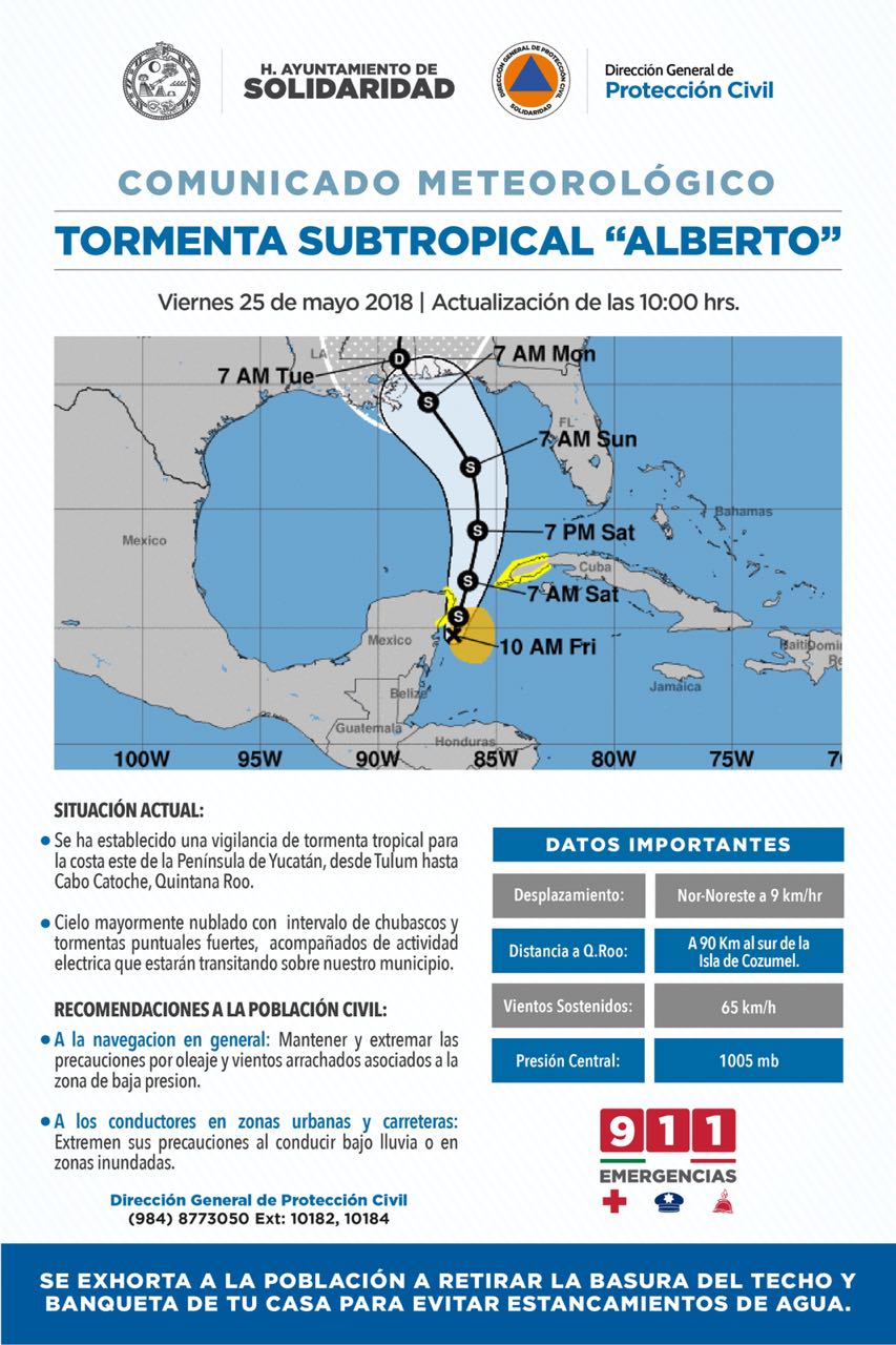 El Centro Nacional de Huracanes de Estados Unidos envió un avión “cazahuracanes” con el que trazó la probable trayectoria de Alberto, que pasará junto al norte de Quintana Roo esta noche, antes de continuar hacia el norte, internándose en el Golfo de México para arribar a Luisiana entre el lunes y martes.