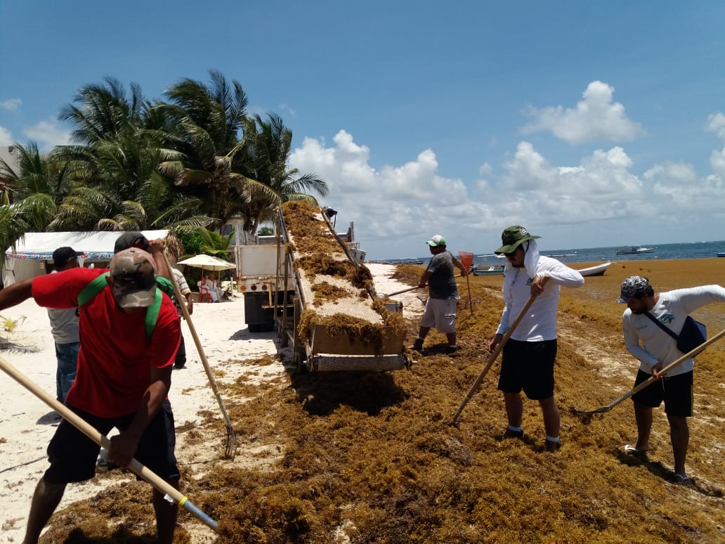 “Estamos trabajando de manera manual alrededor de 100 personas, diariamente, apoyadas por maquinaria y vehículos para continuar con esta titánica labor. Además ya están funcionando unas bandas mecánicas que también apoyan en el retiro del sargazo”, indicó.