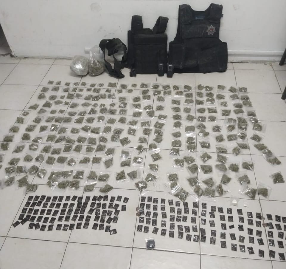 Playa del Carmen.- Un grupo de ocho personas fueron detenidas con cientos de paquetes de droga, tres cargadores de arma de fuego, radios de comunicación y chalecos antibalas, en el fraccionamiento irregular InHouse, de esta ciudad.