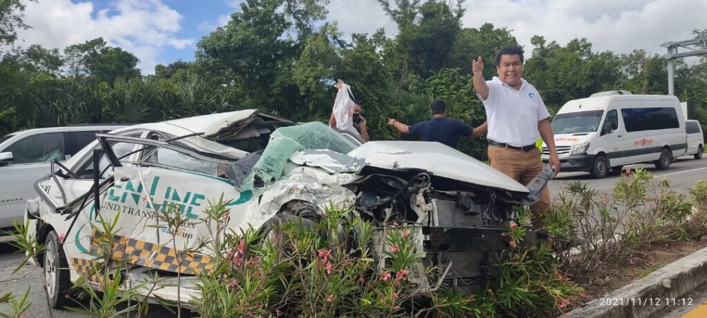 Cancún.- Un enorme caos vial y tres heridos dejó un choque en la salida del Aeropuerto de Cancún hacia la carretera federal 307, cerca del mediodía, entre dos vehículos turísticos, una van y un automóvil.