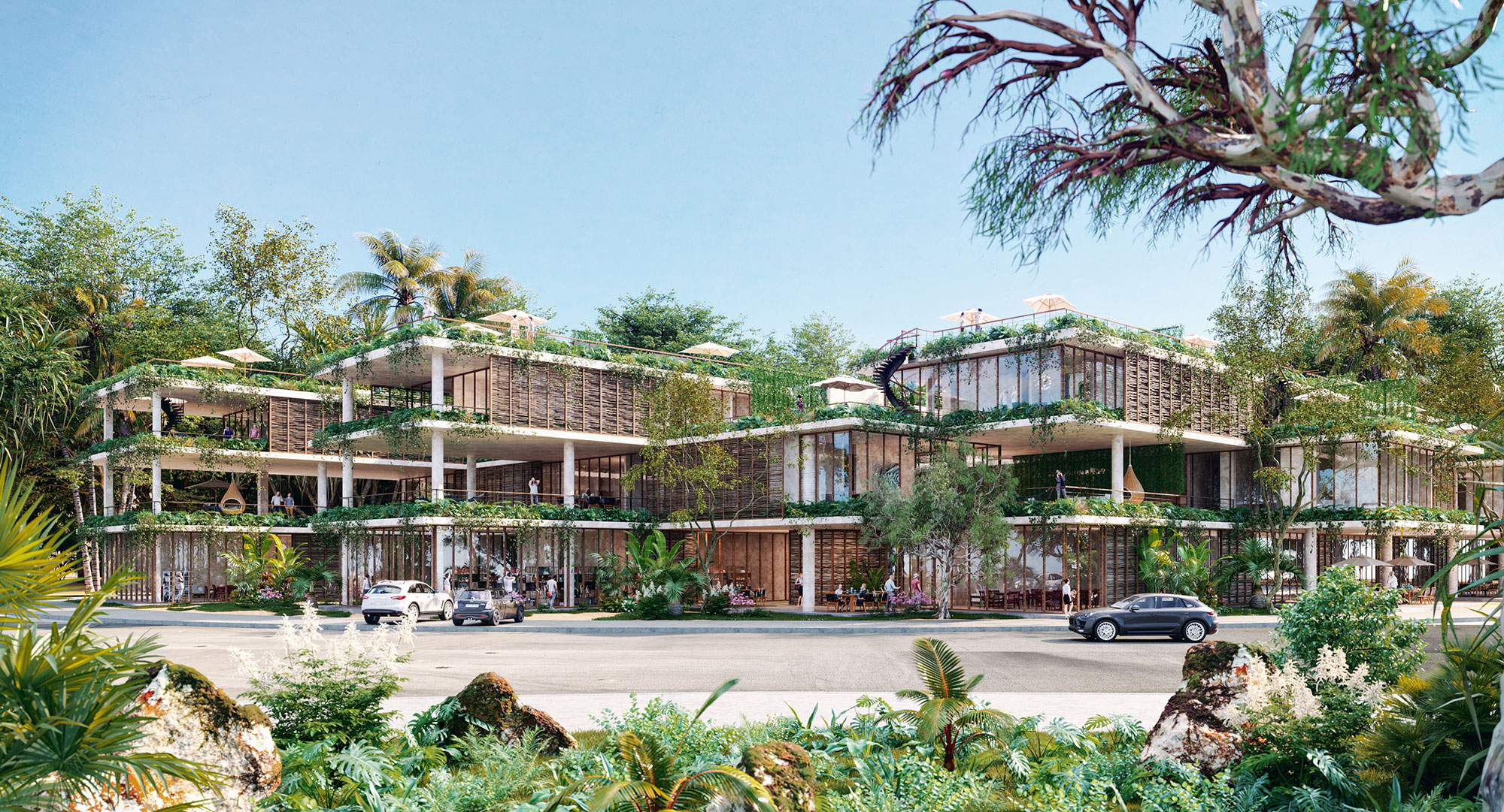 Esta zona residencial se inspiró en las edificaciones y fueron adaptadas para admirar el paisaje de la selva sin tener que dañarla.