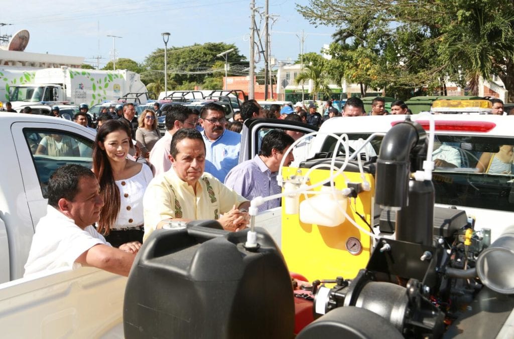 Tulum.- La administración municipal de Tulum fortalecerá las acciones de los servicios municipales en beneficio de la ciudadanía, por ello, el gobernador del estado, Carlos Joaquín González, hizo entrega de cinco camiones recolectores de basura, patrullas, motocicletas para la Dirección de Seguridad Pública y Tránsito Municipal, así como vehículos para la Dirección de Servicios Públicos Municipales, informó el presidente municipal, Víctor Mas Tah.