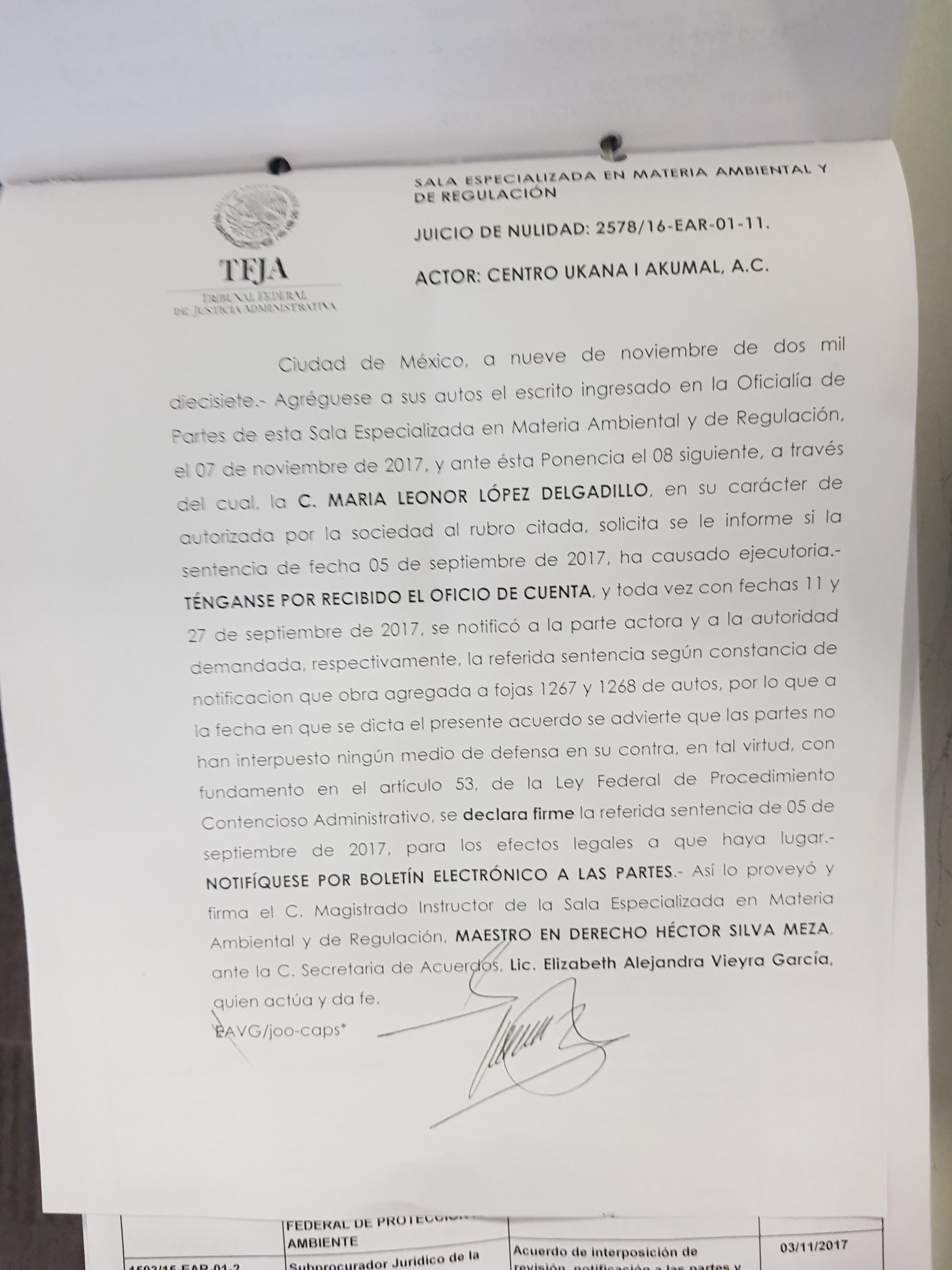 AKUMAL, MX.- La mañana de este martes, en rueda de prensa, el Centro Ecológico Akumal (CEA), presentó el resolutivo de la Sala Especializada en Materia Ambiental del Tribunal Federal de Justicia Administrativa, mediante el cual da la razón a este organismo sobre la propiedad que tiene del predio que es utilizado como acceso a la bahía de Akumal.