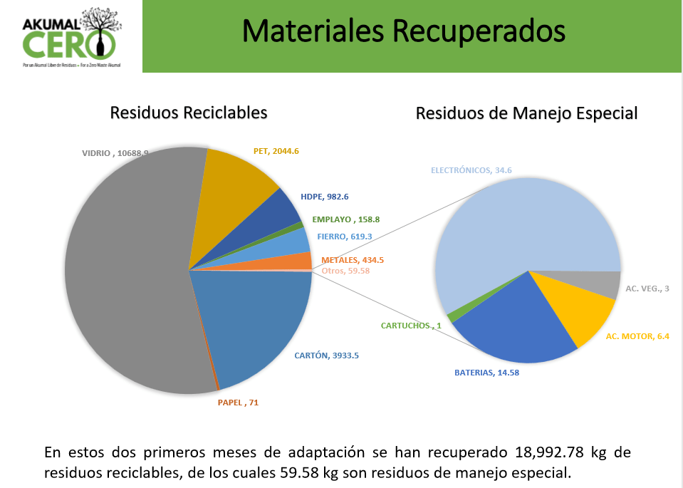 Asimismo se especifica que durante marzo, en el programa Akumal Cero, se realizó en la campaña de reciclaje:el reciclatón mensual, la recolección en un recorrido comunitario y se instaló punto “Recíclame”, donde participan más de 30 empresarios u organizaciones separando u entregando sus residuos.