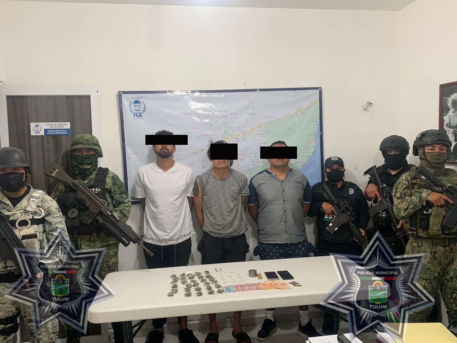 Tulum.- En un operativo coordinado por fuerzas del orden de los tres niveles de gobierno, se logró la detención de 11 hombres y una mujer, presuntamente involucrados en diversos actos delictivos en el Municipio, a quienes también les aseguraron armas y drogas.5 .