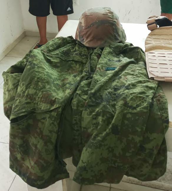 Tulum.- Dos jóvenes fueron detenidos ayer en la comunidad de Macario Gómez, luego de ser descubiertos en posesión de un uniforme del Ejército Mexicano, tres chalecos balísticos y un arma de balines.