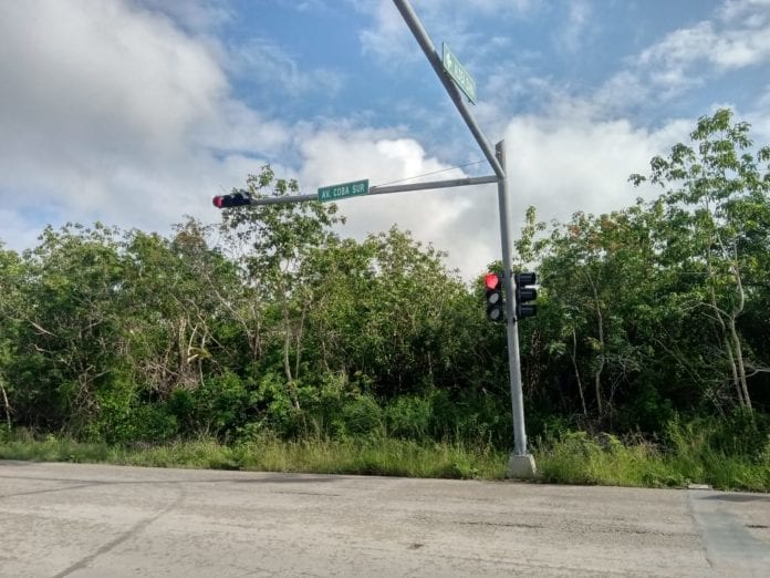 Tulum, 14 de noviembre, 2020. – Mantenimiento preventivo al semáforo de la avenida Cobá sur frente a aldea Zama y colocación de señalamientos en la zona hotelera, realizó la Dirección de Tránsito municipal.