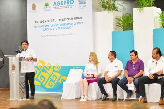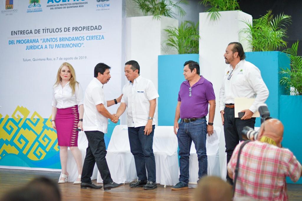 Tulum.- Para garantizar la certeza jurídica a las personas que adquirieron predios en diversos municipios de Quintana Roo, el gobernador del estado, Carlos Joaquín González, les entregó los títulos de propiedad a 32 familias, en ceremonia realizada en la Casa de la Cultura de Tulum.