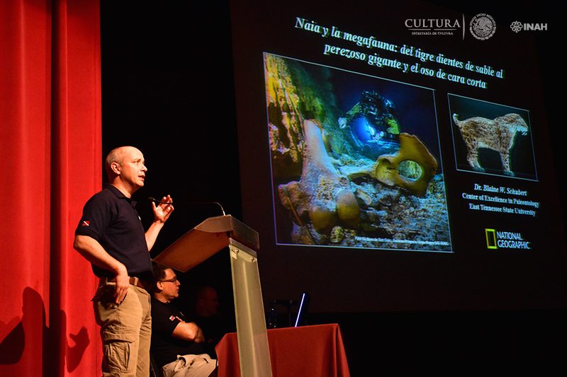 CIUDAD DE MÉXICO, MX.- En la inmensa oquedad subacuática de Hoyo Negro, en Tulum, Quintana Roo, de 62 metros de diámetro y 55 de profundidad, se han encontrado restos de 42 animales del Pleistoceno Tardío, pertenecientes a 13 especies, siete de ellas ya extintas como el gonfoterio, tigre dientes de sable, perezoso gigante de tres tipos, oso tremarctino y un cánido parecido al lobo sudamericano, señaló el doctor Blaine W. Schubert al impartir la conferencia magistral Naia y la megafauna: del tigre dientes de sable al perezoso gigante y el oso de cara corta.