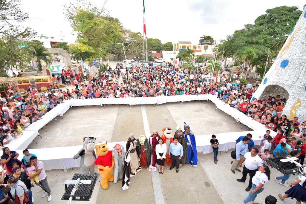 Tulum.- Con el propósito de hacer felices y provocar más sonrisas en los infantes, el presidente municipal, Víctor Mas Tah, acompañado de la presidenta honoraria del DIF Tulum, Celia Aguilar Mas, celebraron el “Día de Reyes” en el Parque Museo de la Cultura Maya, en donde se cortó una rosca monumental para las familias y se entregaron juguetes a los infantes.