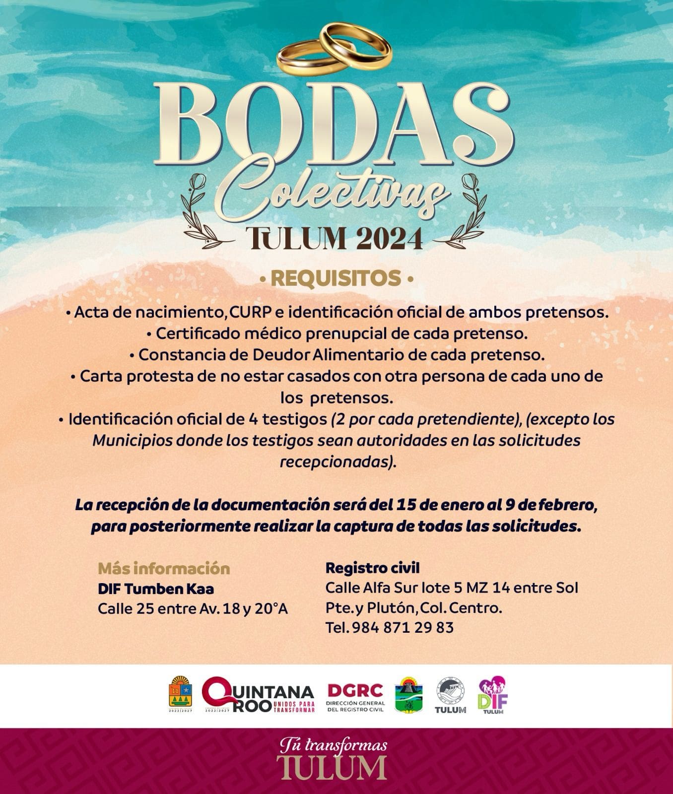 Como ya se señalaba, este próximo viernes 9 de febrero es el último día para que las parejas de Tulum ingresen sus documentos y puedan ser revisados por las autoridades. Pueden llevarlos o pedir mayor información tanto en el DIF Tulum como en el Registro Civil.