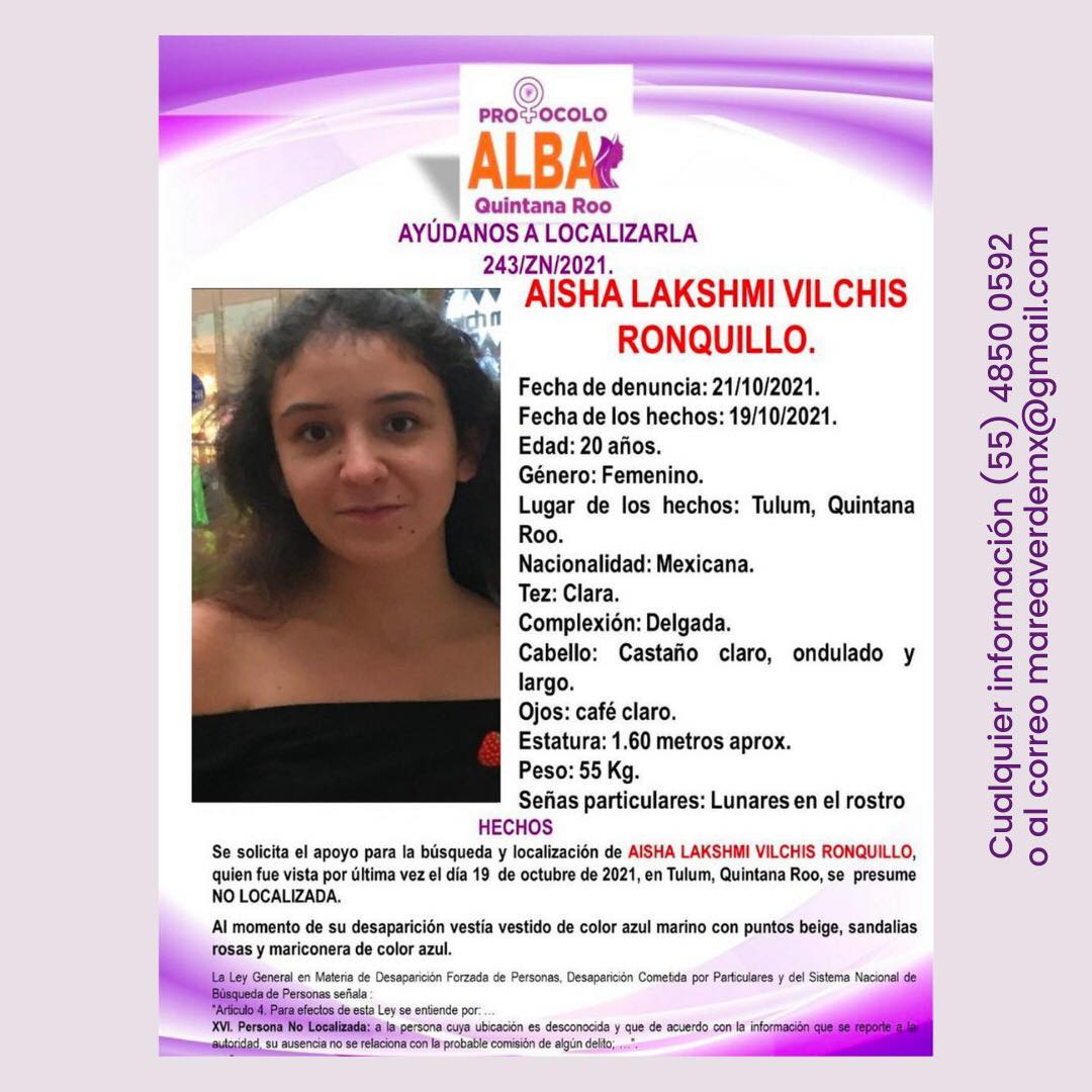 También te puede interesar: Piden apoyo para encontrar a playense Aisha Lakshmi Vilchis Ronquillo; fue vista por última vez en Tulum