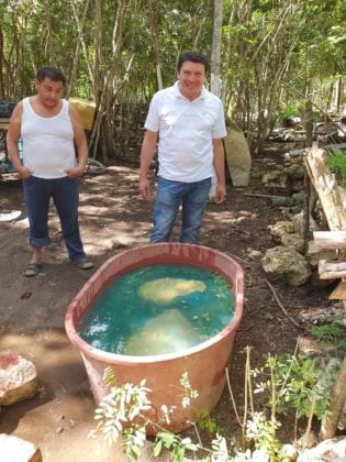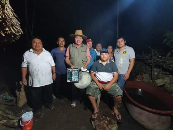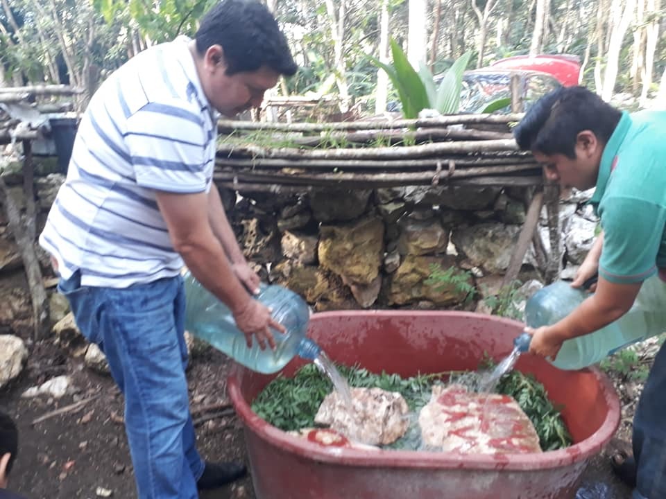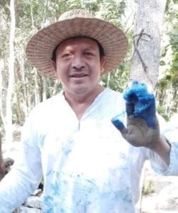 Los pobladores de Coba que participaron en esta hazaña son Justino May (guardián de la planta) Natanael Vela, Lorenzo Vela, Raúl May, Noé Chimal; los propietarios de Aldea Maya Xunáan Kab, Leopoldo Chimal, Hilaria Chooc y sus hijos Arturo y Carlos “y mi amiga Alma Valencia Arana hemos logrado extraer el tan preciado azul, ingrediente principal para el famoso azul maya”, postea el escultor de rostros mayas.