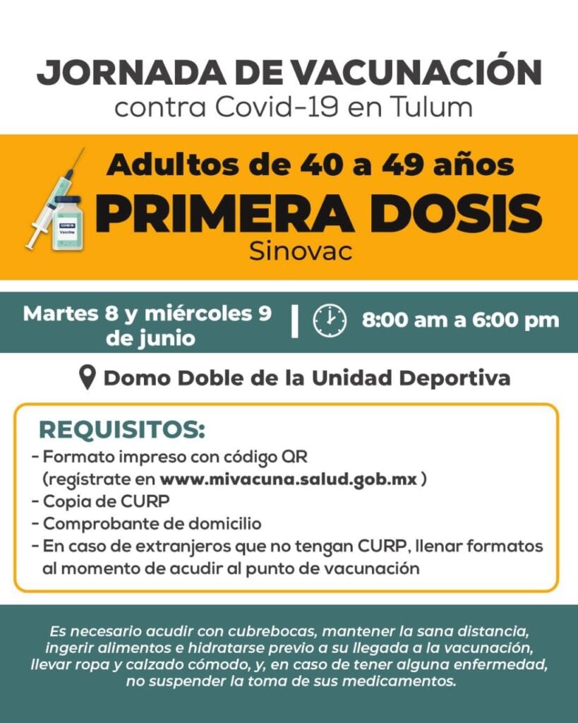Los días martes 8 y miércoles 9 de junio, se llevará a cabo la primera jornada de vacunación contra el Covid 19 para la población con edades entre 40 a 49 años en Tulum.