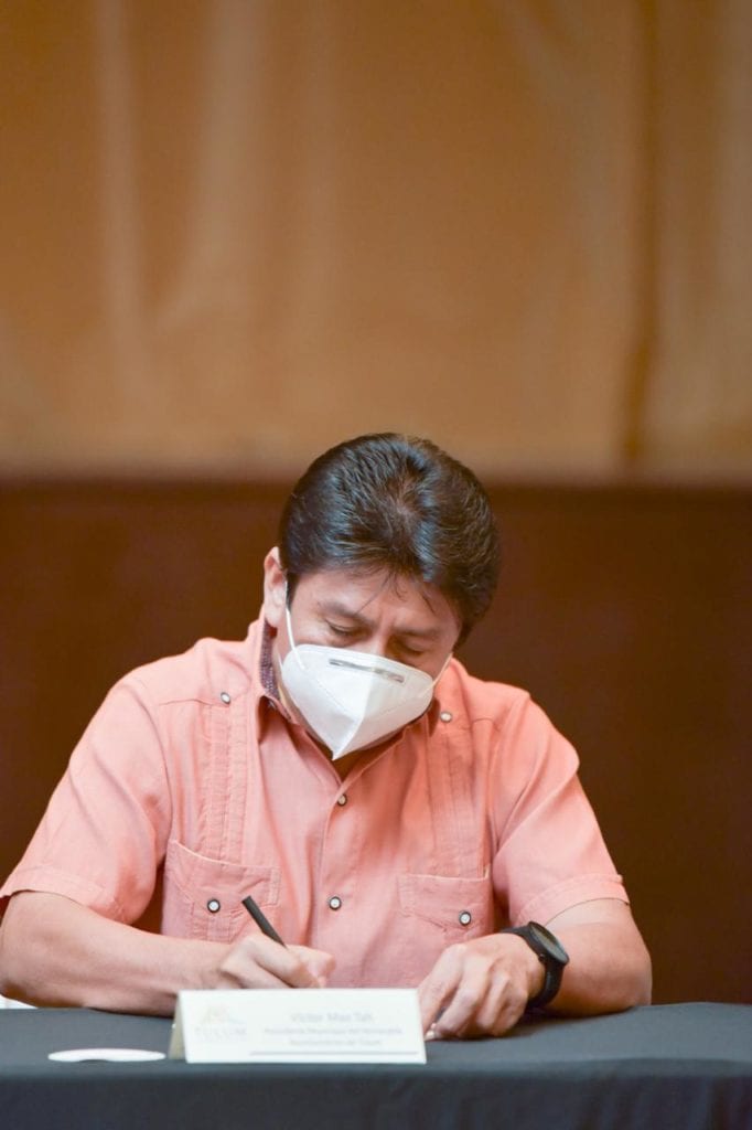 Tulum, 26 de noviembre, 2020.- “A trabajar unidos”, convocó el presidente municipal de Tulum, Víctor Mas Tah, para reducir la afectación que el sargazo pueda ocasionar a la actividad turística del municipio el año entrante, así lo sostuvo en la presentación de resultados del combate al sargazo, a cargo del titular de la Secretaría de Marina (SEMAR) en Quintana Roo, el vicealmirante, Enrique Flores Morado.