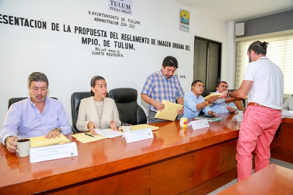 Un grupo de empresarios y profesionistas de Tulum presentó al presidente Víctor Mas Tah y miembros del Cabildo una propuesta de reglamento de Imagen Urbana del Municipio de Tulum, la cual será revisada y analizada en reuniones de trabajo de los concejales a la brevedad posible.