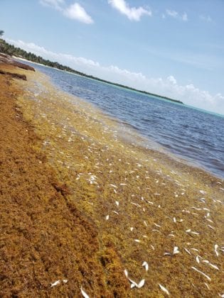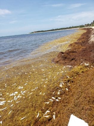 Recala cardumen de peces muertos por sargazo en Tulum