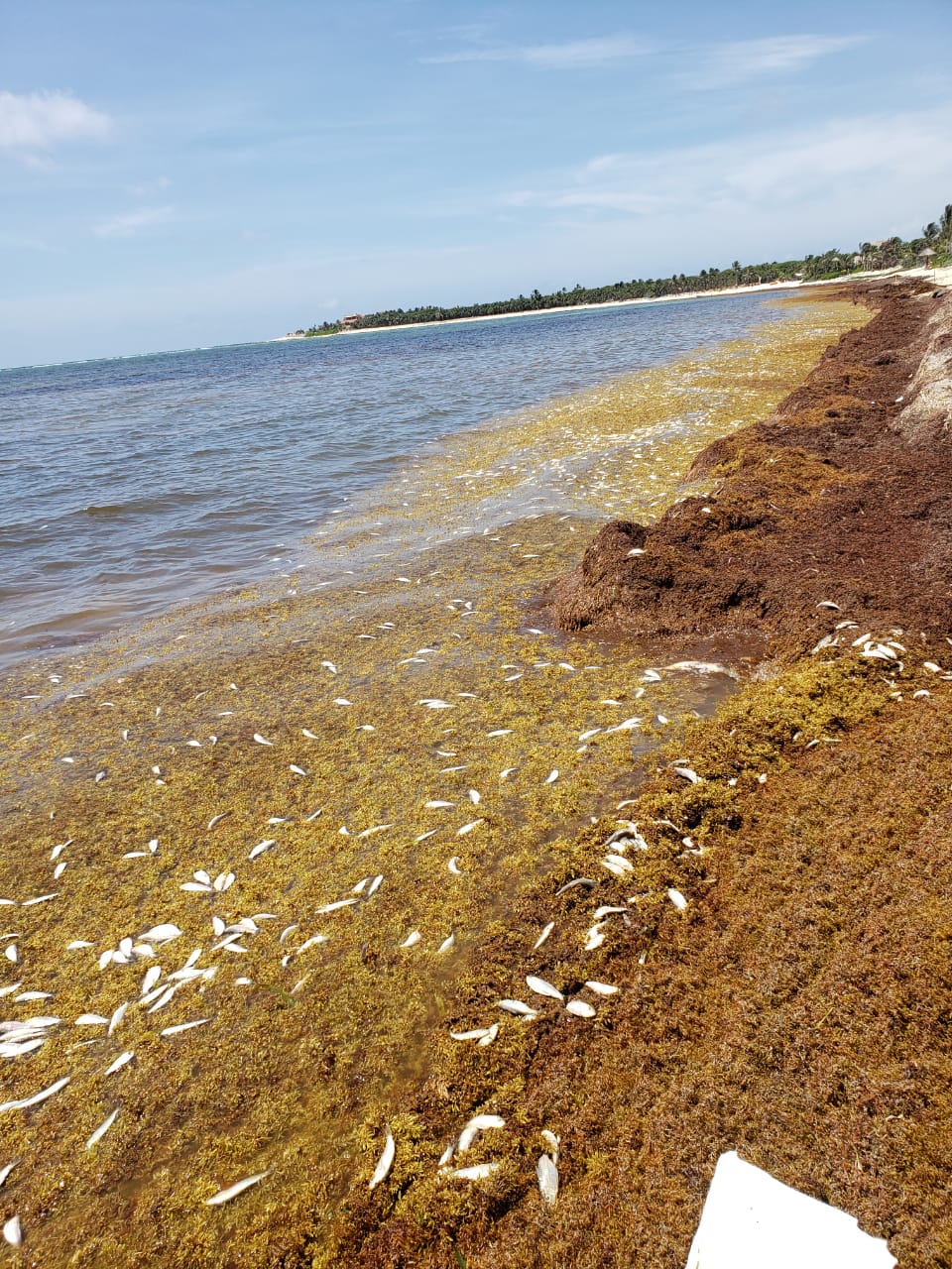 A través de una denuncia en redes sociales, se exhibió un cardumen de peces muertos sobre una densa capa de sargazo en una playa de Tulum.