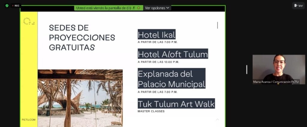 Las sedes de las proyecciones gratuitas serán el Hotel Aloft Tulum a partir de las 12 del mediodía; Hotel Ikal a partir de las 7:00 de la noche; la explana del Palacio Municipal a partir de las 7:30 de la noche y Tuk Tulum Art Walk que tendrá el “master classes”.