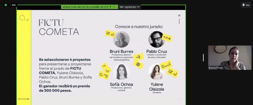 “Fictu Cometa” seleccionará cuatro proyectos para presentarse frente al jurado integrado por Bruni Burres, productora, asesora de Sundance y guionista cinematográfica; Pablo Cruz, creador y productor de cine y televisión; Sofía Ochoa, productora y gestora cultural; y, Yulene Olaizola, cineasta; el ganador recibirá un premio de 200 mil pesos.