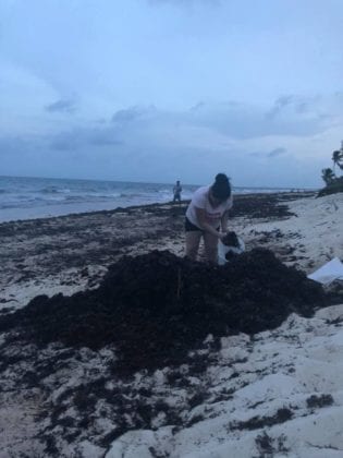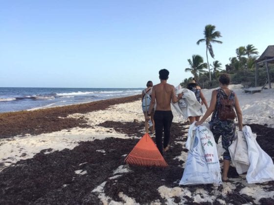 Este domingo, personas de todas las edades, familias enteras, mujeres, niños y jóvenes se dedicaron a recoger con rastrillos el sargazo y depositarlo en costales, como bien se pudo apreciar en la publicación de la usuaria Cath Bueno en el mismo grupo de Facebook de Mujeres Tulum.