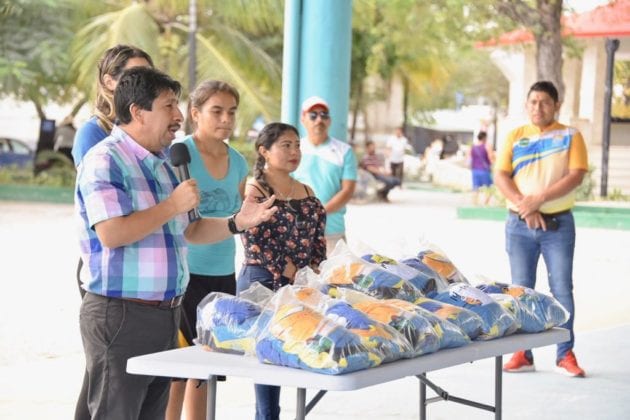 Tulum.- El presidente municipal, Víctor Mas Tah, entregó uniformes a la delegación de deportistas de las especialidades de basquetbol y boxeo, quienes viajaron al municipio de Benito Juárez, para participar en la fase estatal de la Olimpiada Nacional del 22 al 24 de Marzo y los exhortó a poner en alto el nombre del municipio.