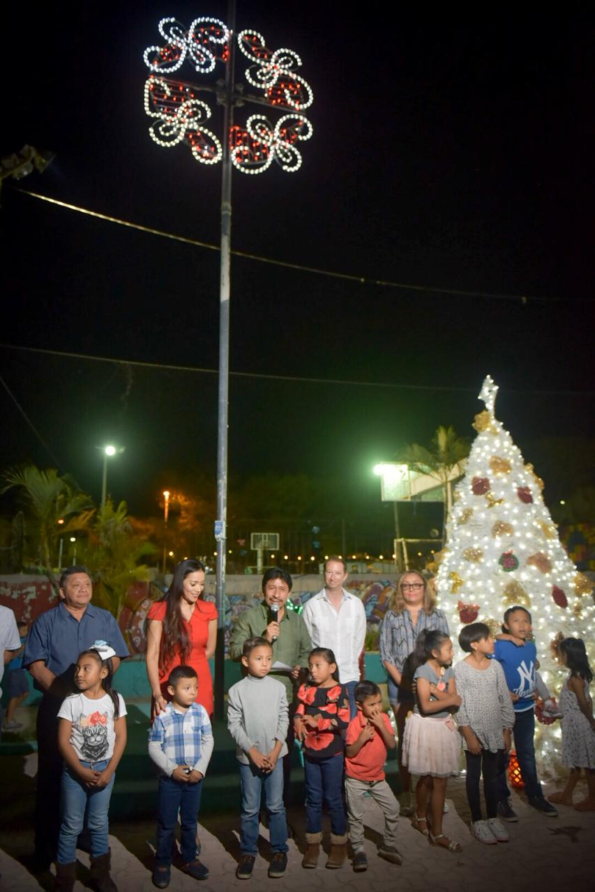 Reconoció que como resultado de la colaboración de Martha Yuridia Fernández, coordinadora del proyecto “Intégrate Akumal”, se logró que por primera ocasión esta comunidad de la Riviera Tulum cuente con adornos decembrinos, lo cual permitirá a las familias reunirse en este sitio durante las noches y los niños jugar en los remodelados juegos infantiles.