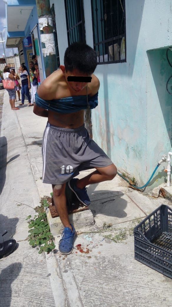 Playa del Carmen.- Un joven de 15 años de edad fue golpeado y amarrado por vecinos, luego de ser atrapado robando un celular, en los límites entre los fraccionamientos Misión de las Flores y Las Palmas 1.