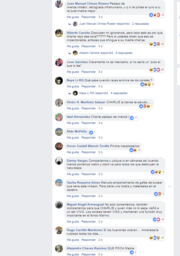 El cibernauta Juan Cardona extendió un mensaje a Charlie, autor de tan deplorable acto contra la naturaleza marina, a quien dijo: “Hola Charlie. De verdad no se de dónde eres, quién eres, si eres cliente, guía y/o instructor (que también me gustaría platicar con él) snorkel, buzo pero sinceramente tu nivel de cultura, educación y valores no corresponden a la de alguien que pueda cuidar ni de si mismo“.